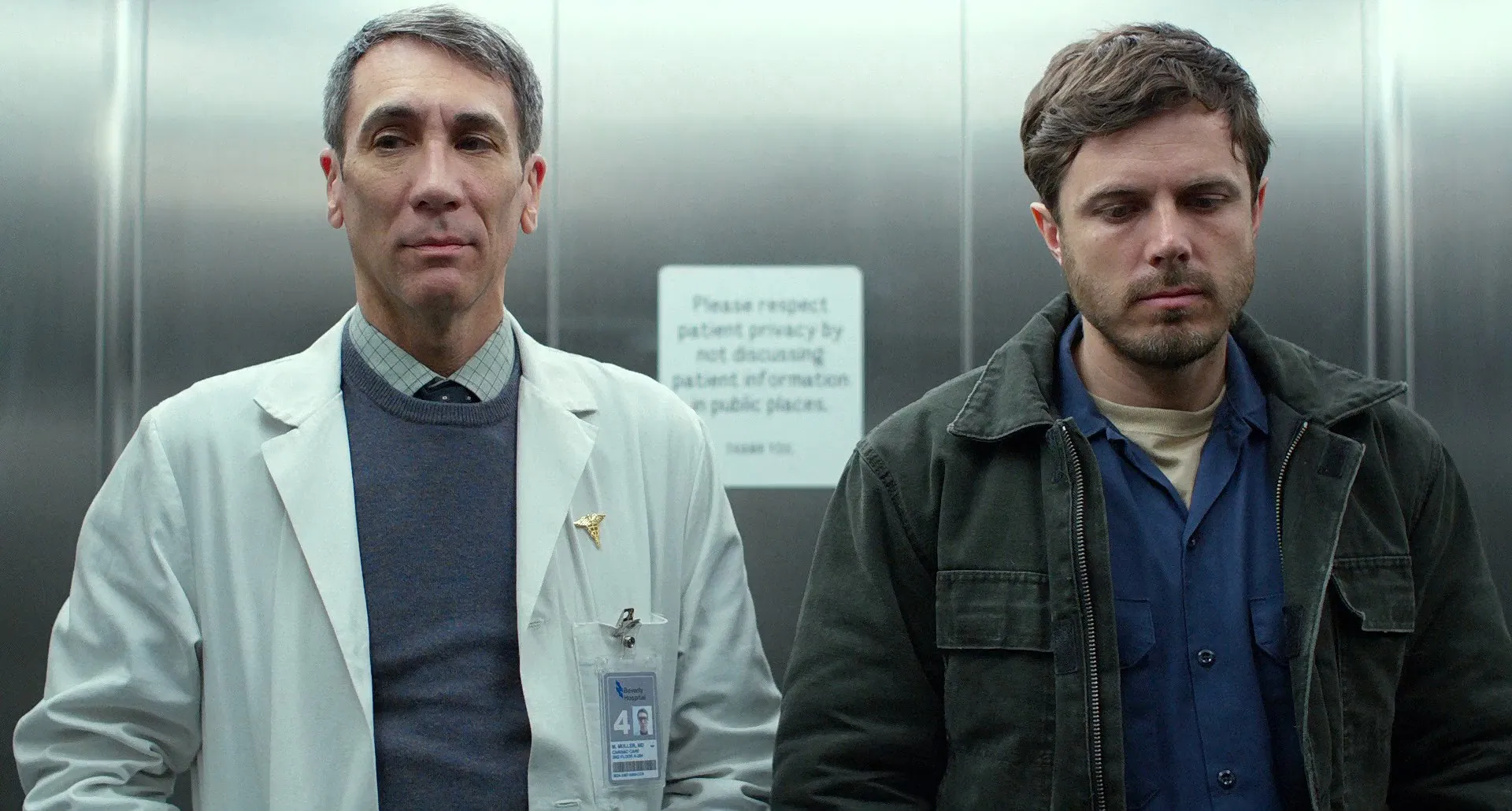 Actors: Casey Affleck as Lee Chandler, Lucas Hedges as Patrick Chandler, Michelle Williams as Randi Chandler, Kyle Chandler as Joe Chandler, C.J. Wilson as George, Gretchen Mol as Elise Chandler, Heather Burns as Jill, Ivy O'Brien as Young Patrick Chandler, Josh Hamilton as Wes (Joe's Lawyer), Matthew Broderick as Jeffrey, Tate Donovan as Hockey Coach, Anna Baryshnikov as Sandy, Richard Donelly as Mr. Martinez (1st Tenant), Virginia Loring Cooke as Mrs. Groom (2nd Tenant), Quincy Tyler Bernstine as Marianne (3rd Tenant), Missy Yager as Mrs. Olsen (4th Tenant), Stephen McKinley Henderson as Mr. Emery, Ben Hanson as Bartender, Mary Mallen as Sharon, Lewis D. Wheeler as 1st Businessman at Bar, Anthony Estrella as 2nd Businessman at Bar, Susan Pourfar as Nurse Irene, Robert Sella as Dr. Muller, Ruibo Qian as Dr. Bethany, Tom Kemp as Stan Chandler, Chloe Dixon as Suzy Chandler, Ellie Teves as Karen Chandler, Paul Meredith as Paul (Assistant Principal), Carolyn Pickman as Paul's Assistant, Christian J. Mallen as CJ, Oscar Wahlberg as Joel, Kara Hayward as Silvie, Wendy Overly as Wes's Assistant, Shawn Fitzgibbon as Tom Doherty (Ping-Pong Player), Glenn McKiel as Manchester Police Chief, Joe Stapleton as Fire Marshall, Brian Chamberlain as Investigating Detective, Kenneth Lonergan as Manchester Pedestrian, Jackson Damon as Otto, Jami Tennille as Janine, Liam McNeill as Josh (Randi's Husband), Allyn Burrows as Father Martin, Nellie Lonergan as 1st Girl at School ("Godspell"), Brian A. White as Jerry (Guy in Boat Yard Office), Erica McDermott as Sue (Angry Boss in Boat Yard Office), Danae Nason as Rachel (Randi's Friend), Frank Garvin as Homeowner, William Bornkessel as George's Son, Kt Baldassaro as Bar Patron (uncredited), Zain Ullah as Young Micheal, Amanda Blattner as